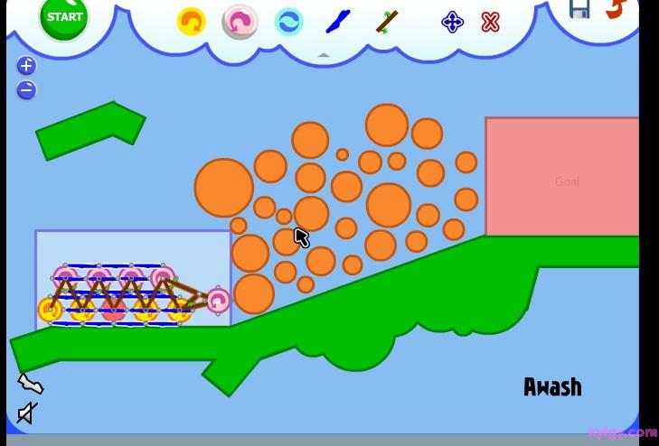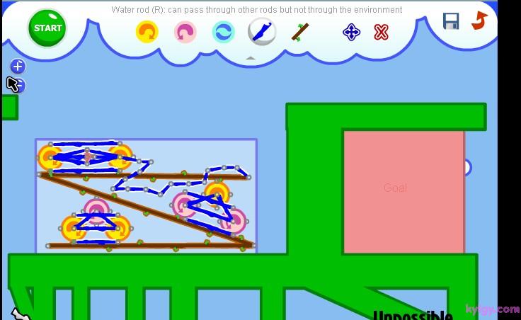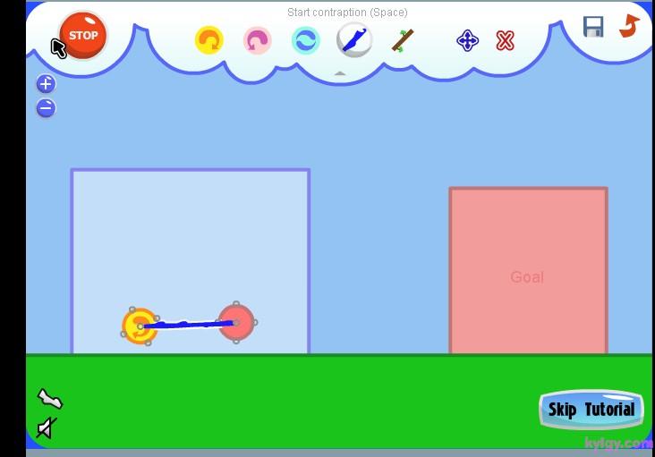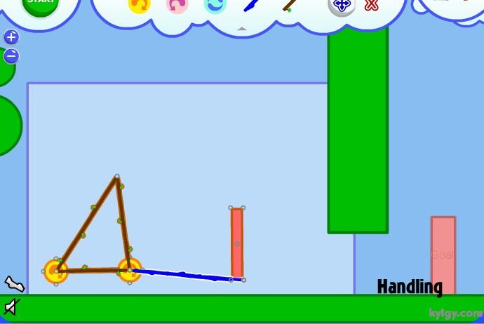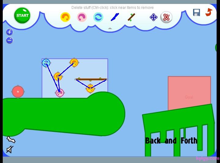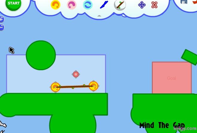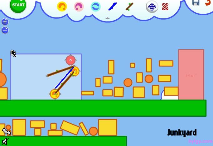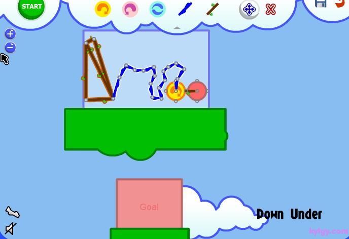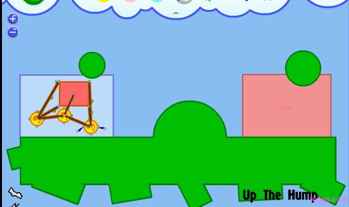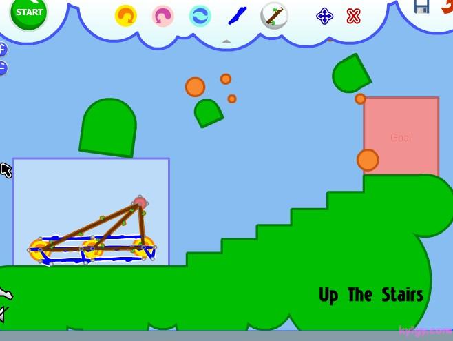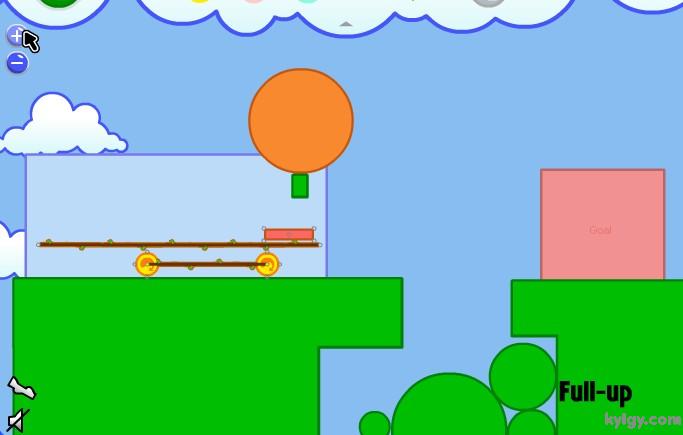 | 游戏说明(异想天开的机器):在如果你组合好了,并且想让装置运行起来。那就按下“START”,你就会发现这个神奇的小东西开始动起来了!这就是Fantastic Contraption,一款充满了益智乐趣和极易上瘾的游戏。 游戏的操作很简单,每关让指定的目标移动到指定的红色区域即可通过。点击右上角的齿轮来展开道具功能栏,选择各种道具加以组合搭配,来让目标能够向目的地移动。可选用的道具相当多样,可以左右移动的小轮、链绳、杠杆等等。如果觉得搭配错误了,也可以在功能区内选择“X”来消除。而且在组合的时候,会有一个单独的小视框对组合部分进行放大映出,可以方便的进行组合。左右下角的“- +”按键是缩放时间,按住屏幕可以进行拖拽移动。而且你可以记录自己认为组合得很好的搭配,还可以自己设计关卡来让别人挑战。 |