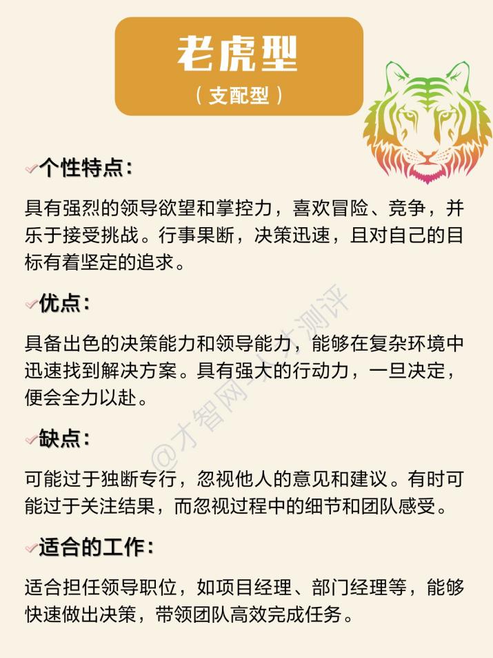 1.老虎型(支配型):企图心强烈,喜欢冒险,个性积极,竞争力强。通常喜欢掌控全局并发号施令,不喜欢维持现状。行动力强,一旦目标确立,便会全力以赴。他们约占人口的15%,通常是有决断力的领导者。