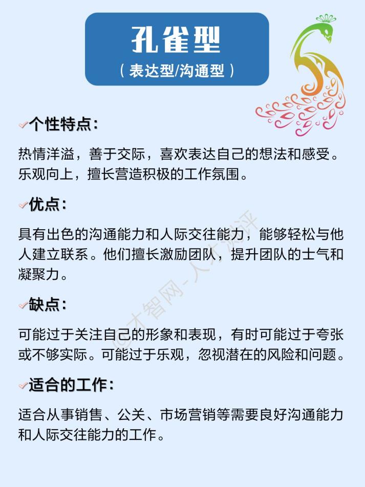 2.孔雀型(表达型/沟通型):热情洋溢,善于交际,说话流畅,并重视个人形象。擅长建立人际关系,富有同理心,并能通过建立同盟或搞好关系来实现目标。很适合需要当众表现、引人注目、态度公开的工作。他们也约占人口的15%,通常是能营造气氛、宣扬理念、塑造愿景的能手。