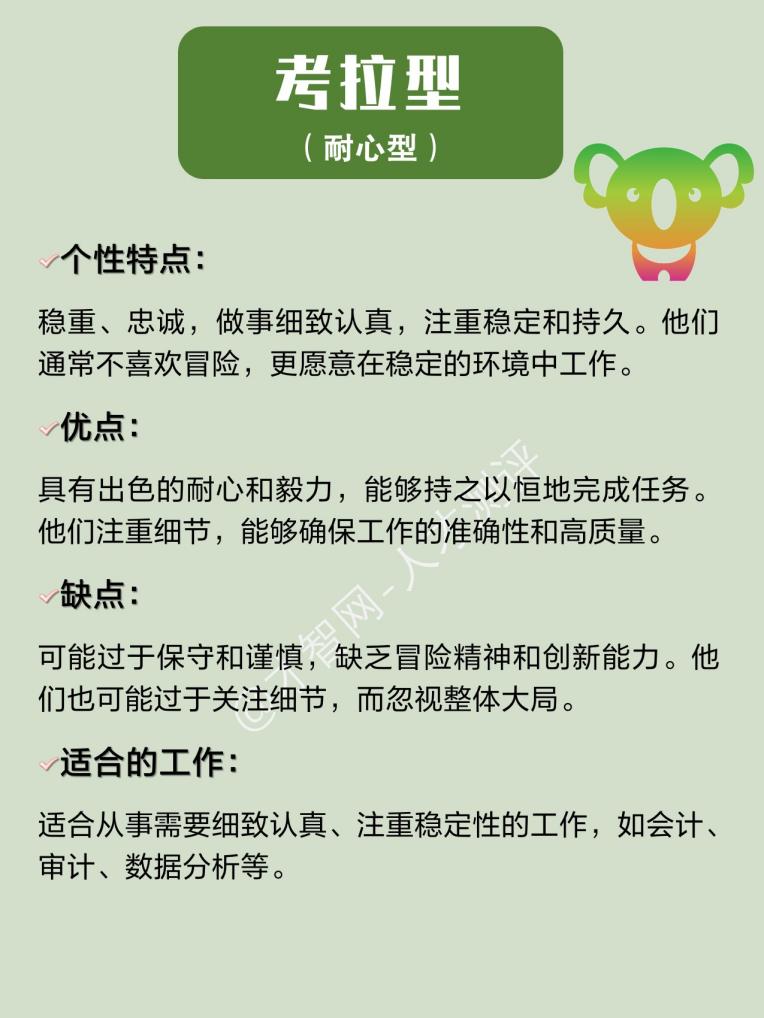 3.考拉型(耐心型):行事稳健,性格平和,不喜欢制造麻烦或兴风作浪。可能看起来懒散或不积极,但只要决定投入,就会展现出坚韧不拔的精神。