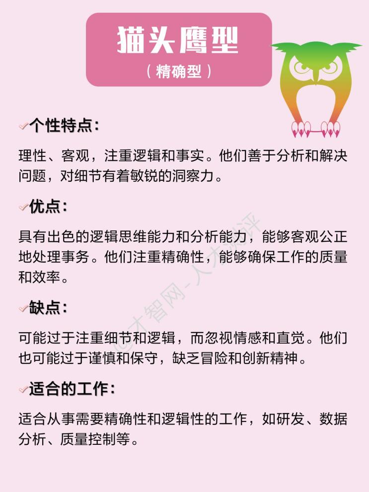 4.猫头鹰型(精确型):通常非常注重细节和准确性,善于分析和逻辑思考,能够深入理解和解决复杂的问题。往往对事物有独到的见解,并善于从大量的信息中筛选出关键的信息。