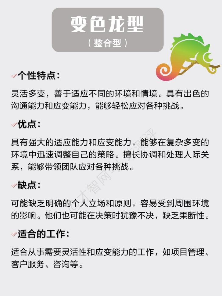 5.变色龙型(整合型):善于适应不同的环境和情况,具有灵活的思维和解决问题的能力。通常能够与各种类型的人建立良好的关系,并在团队中发挥协调和整合的作用。