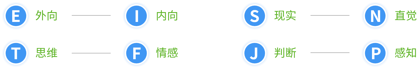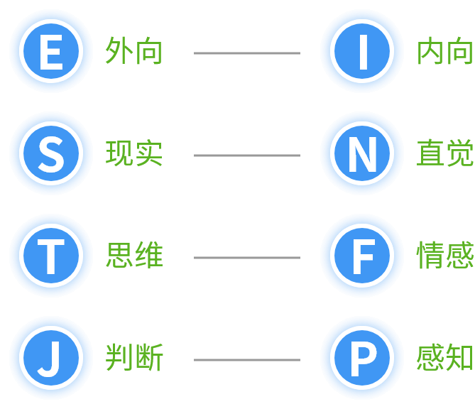 通过对照四个维度的描述,您或许已经识别出自己在每个维度上的偏好,取每个维度上偏好类型的代表字母,即可以由四个字母构成您的性格类型。如ISFJ,即内倾感觉情感判断型;ENFP,即外倾直觉情感感知型。