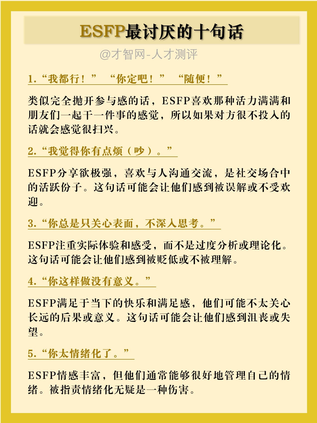 ESFP注重实际体验和感受,而不是过度分析或理论化。这句话可能会让他们感到被贬低或不被理解。
