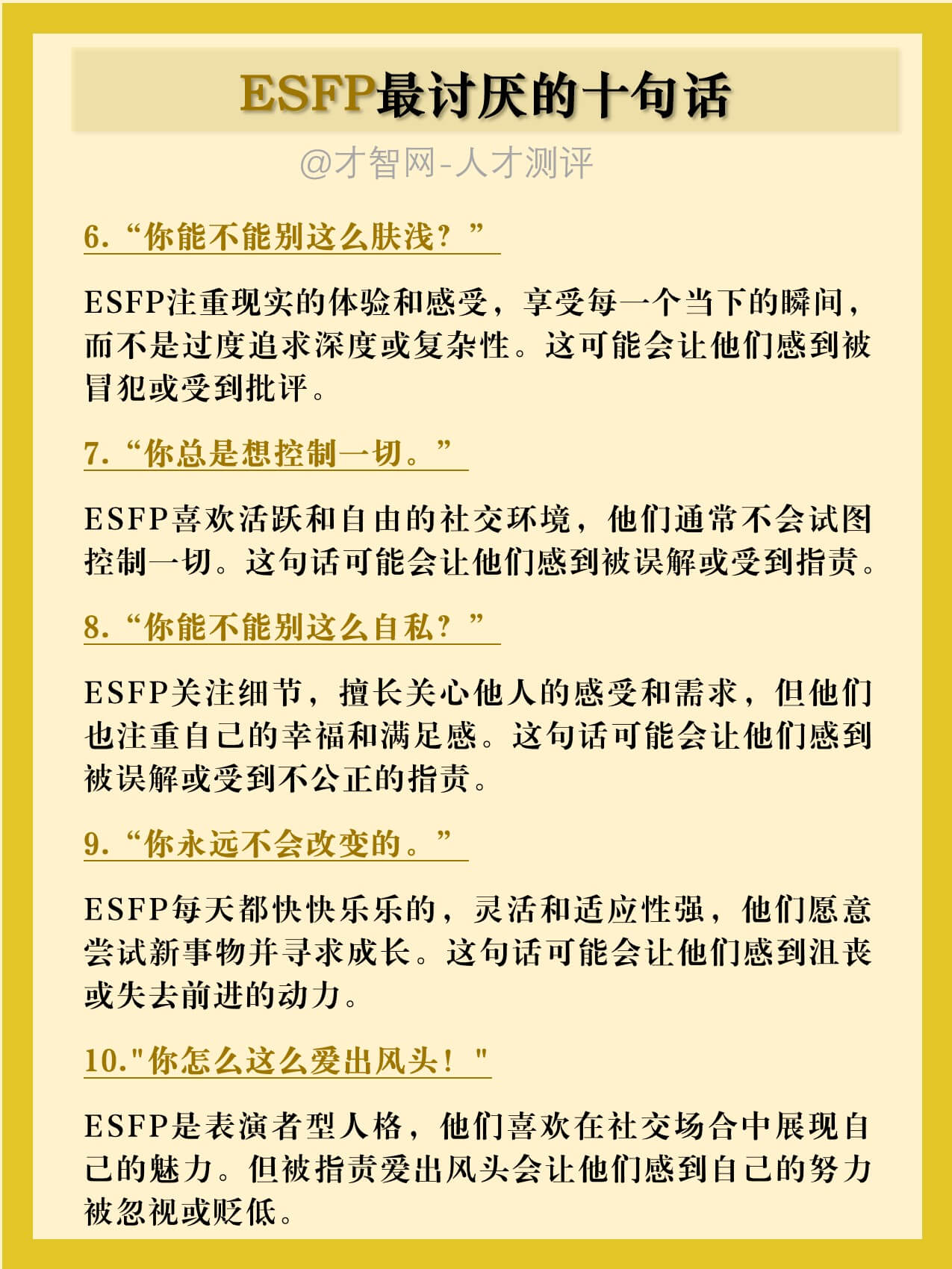 ESFP关注细节,擅长关心他人的感受和需求,但他们也注重自己的幸福和满足感。这句话可能会让他们感到被误解或受到不公正的指责。
