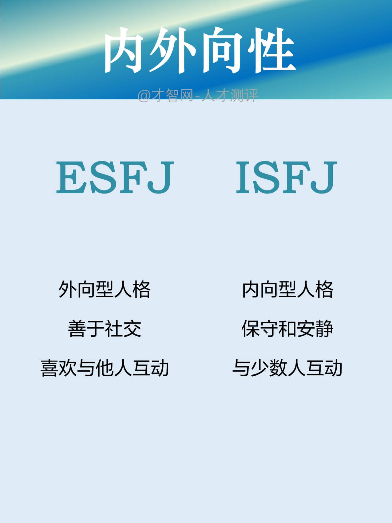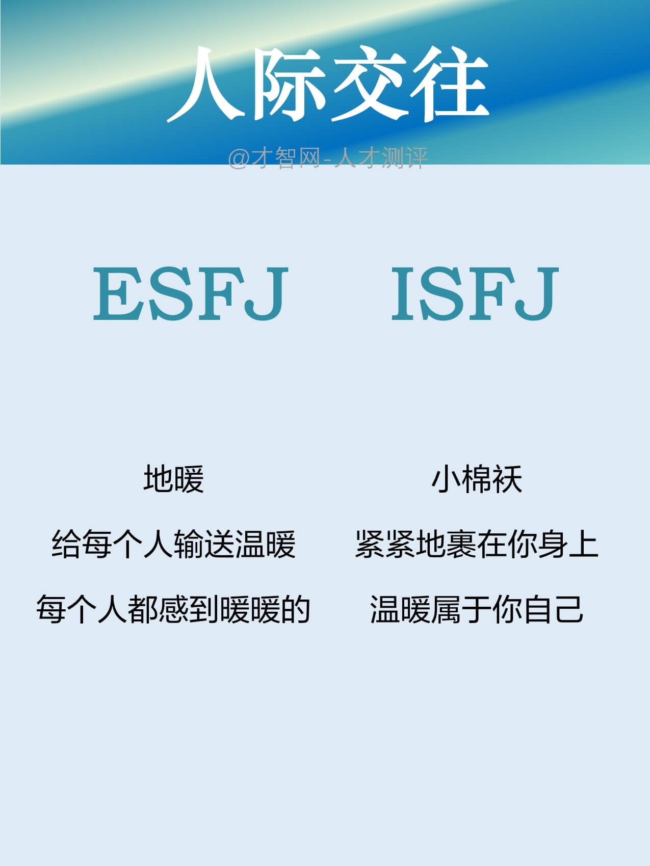 ESFJ:外向型人格,善于社交,喜欢与他人互动。