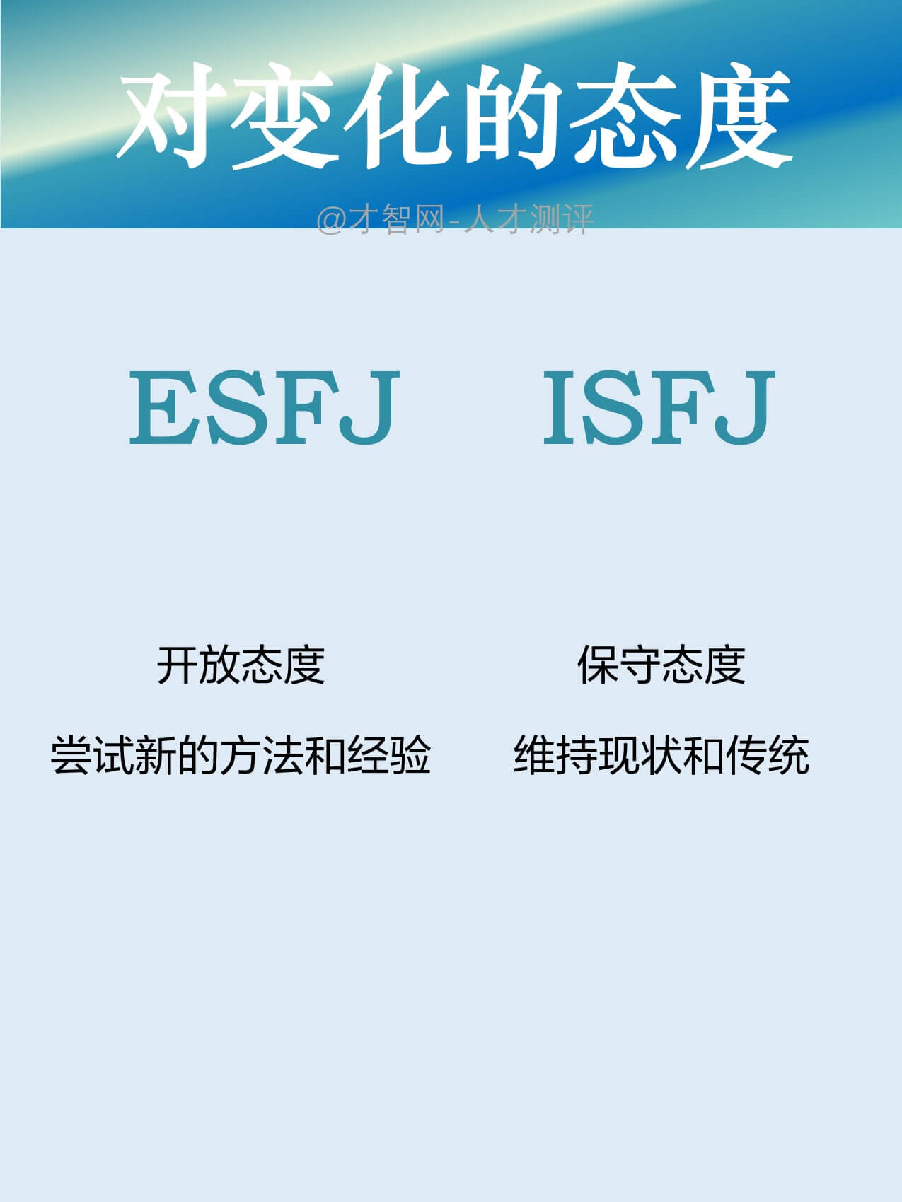 ISFJ:保守态度,维持现状和传统。