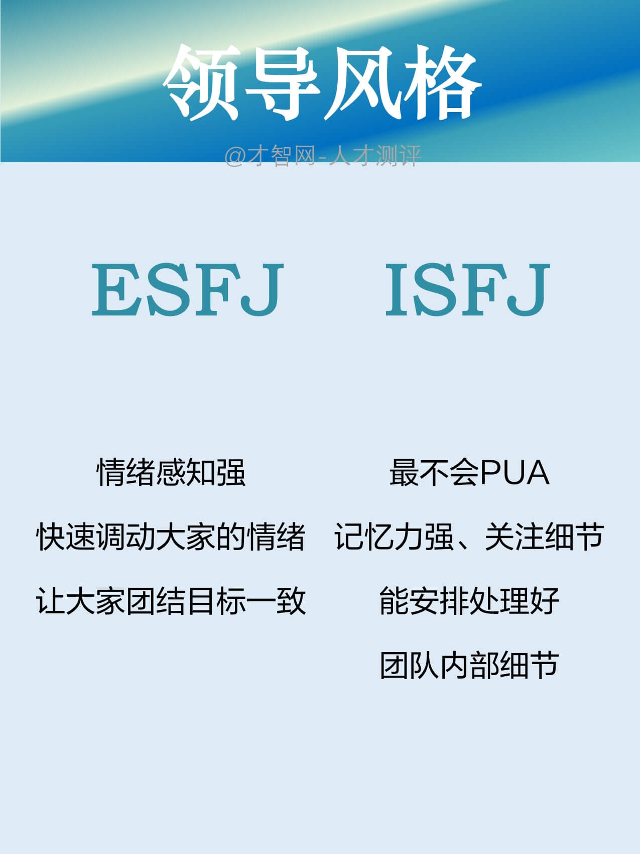 ISFJ:最不会PUA,记忆力强、关注细节,能安排处理好团队内部细节。