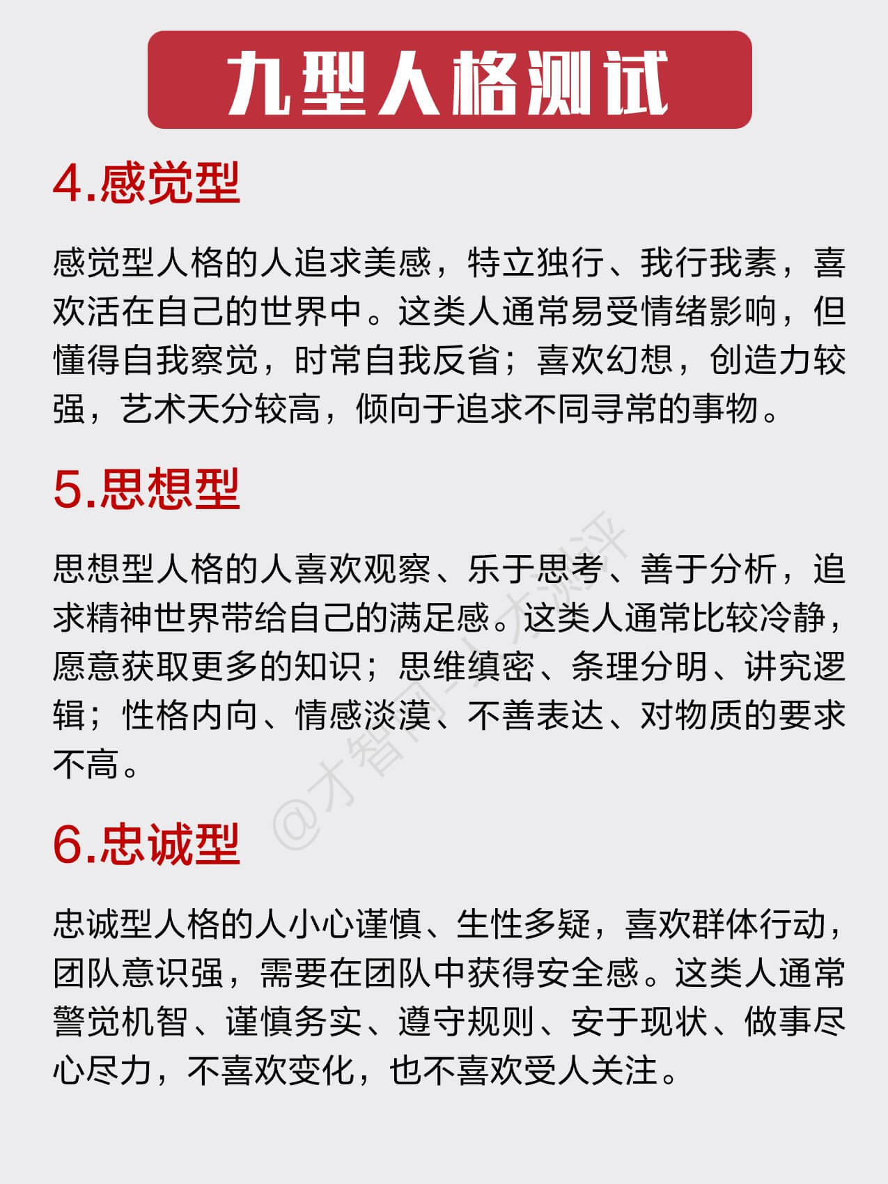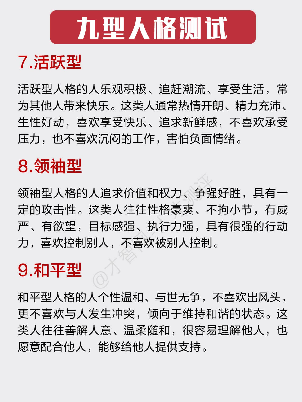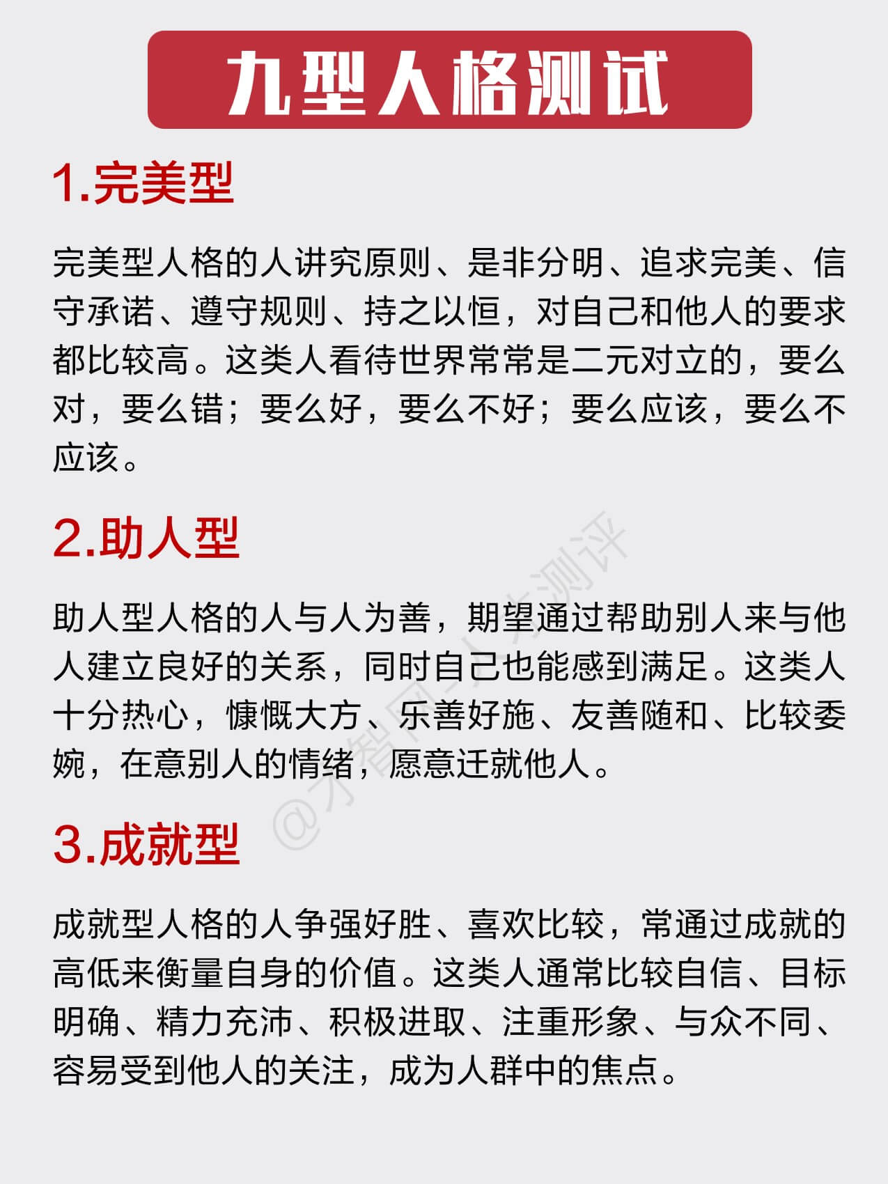 九型人格测试的人格分类分别是完美型、助人型、成就型、感觉型、思想型、忠诚型、活跃型、领袖型、和平型。