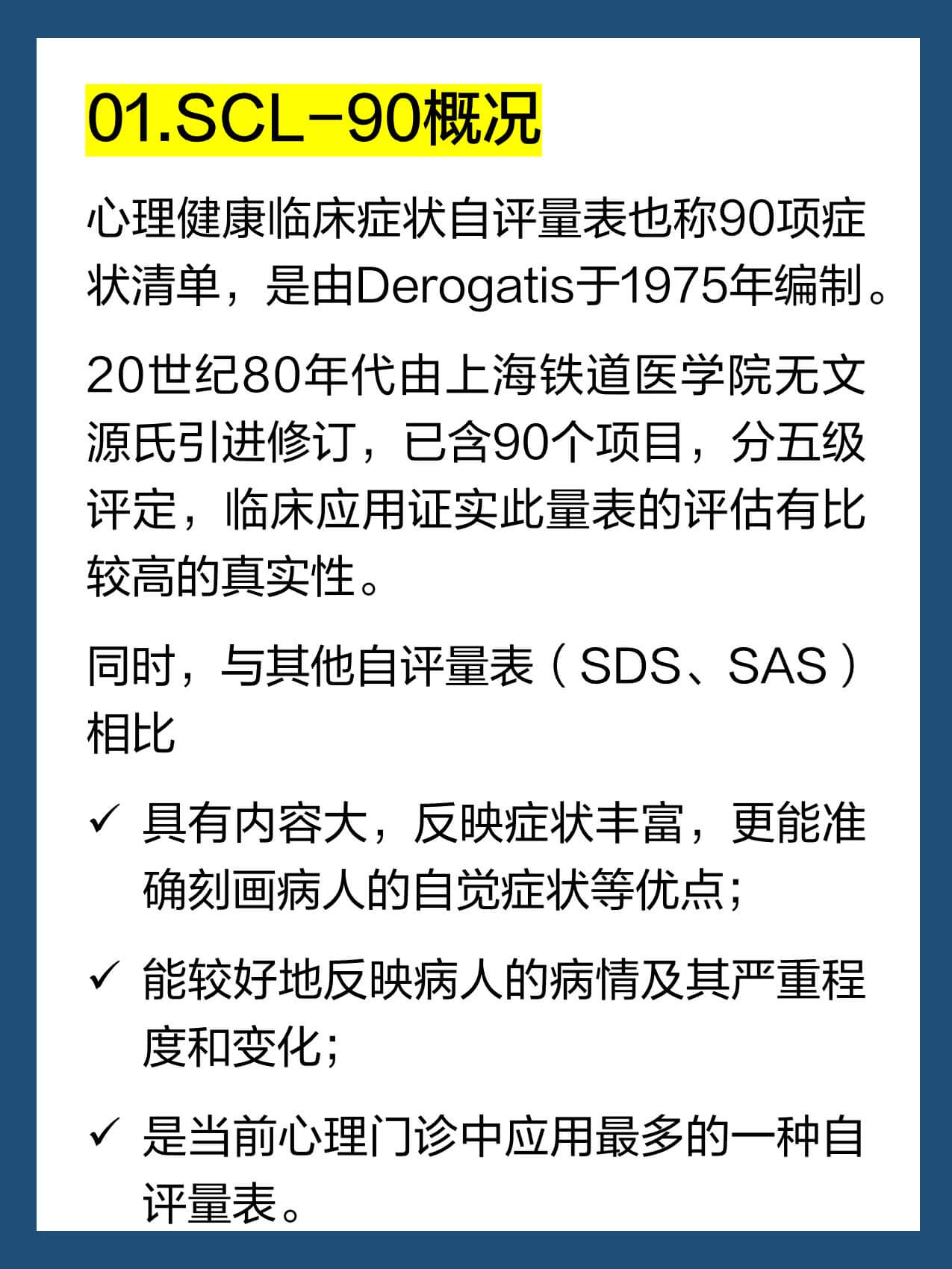20世纪80年代由上海铁道医学院无文源氏引进修订,已含90个项目,分五级评定,临床应用证实此量表的评估有比较高的真实性。