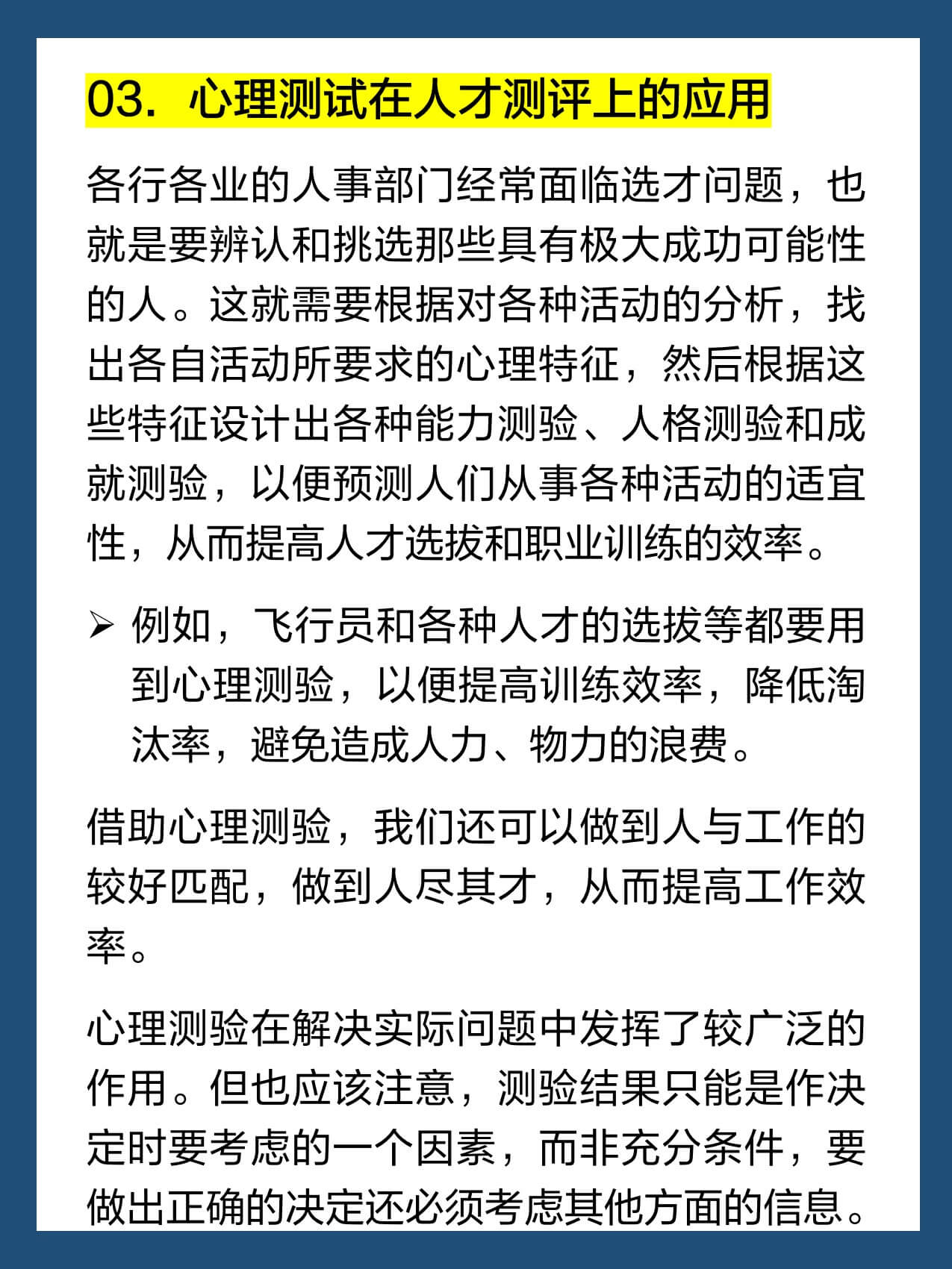 例如,飞行员和各种人才的选拔等都要用到心理测验,以便提高训练效率,降低淘汰率,避免造成人力、物力的浪费。