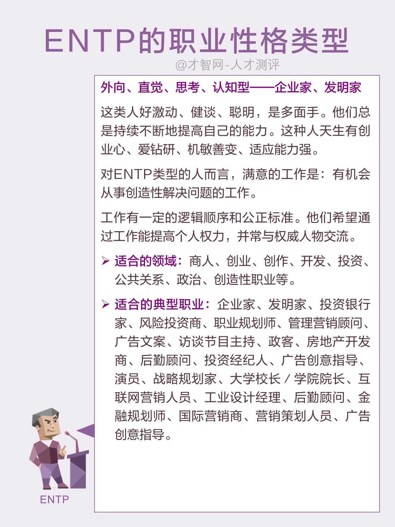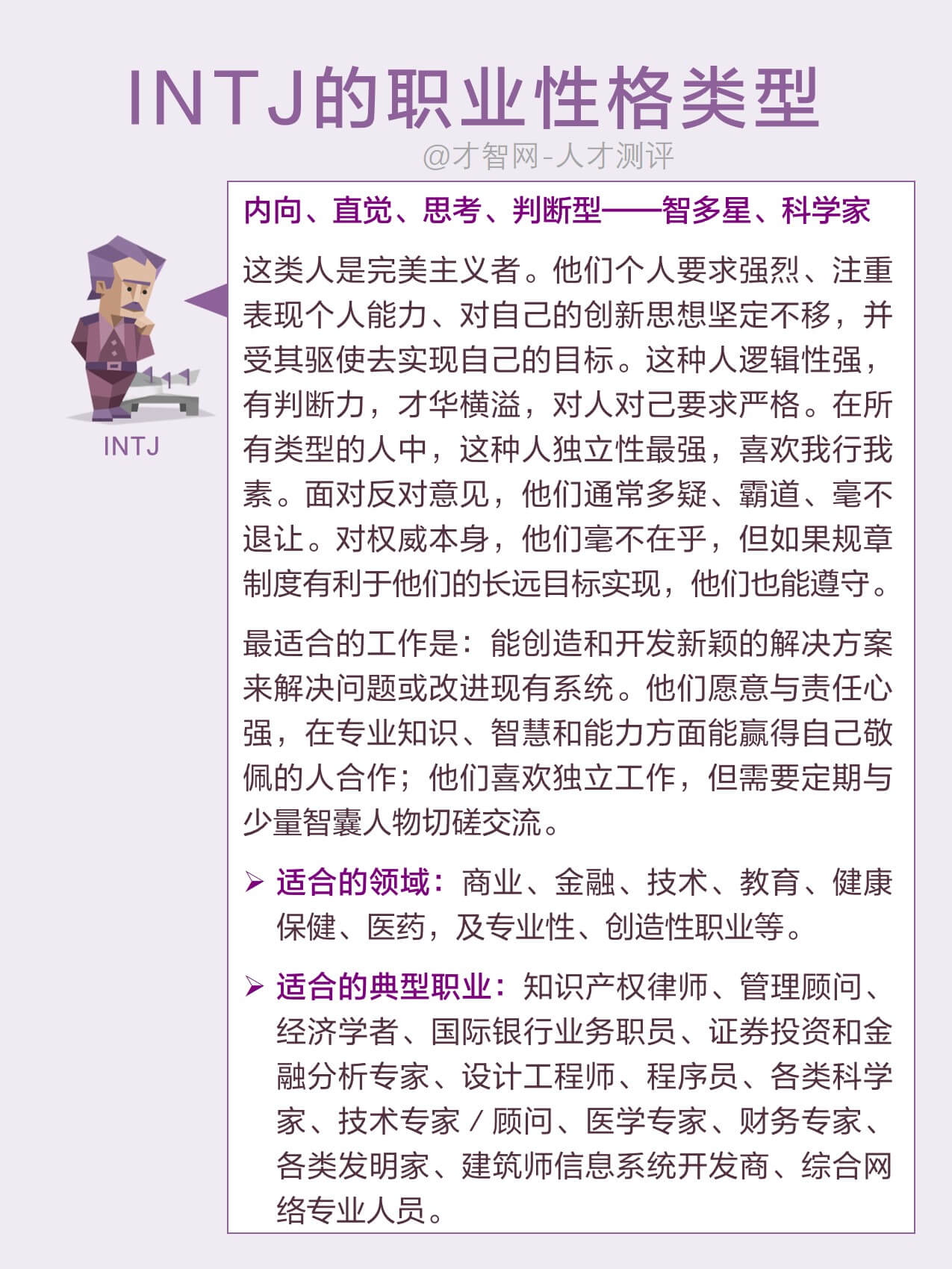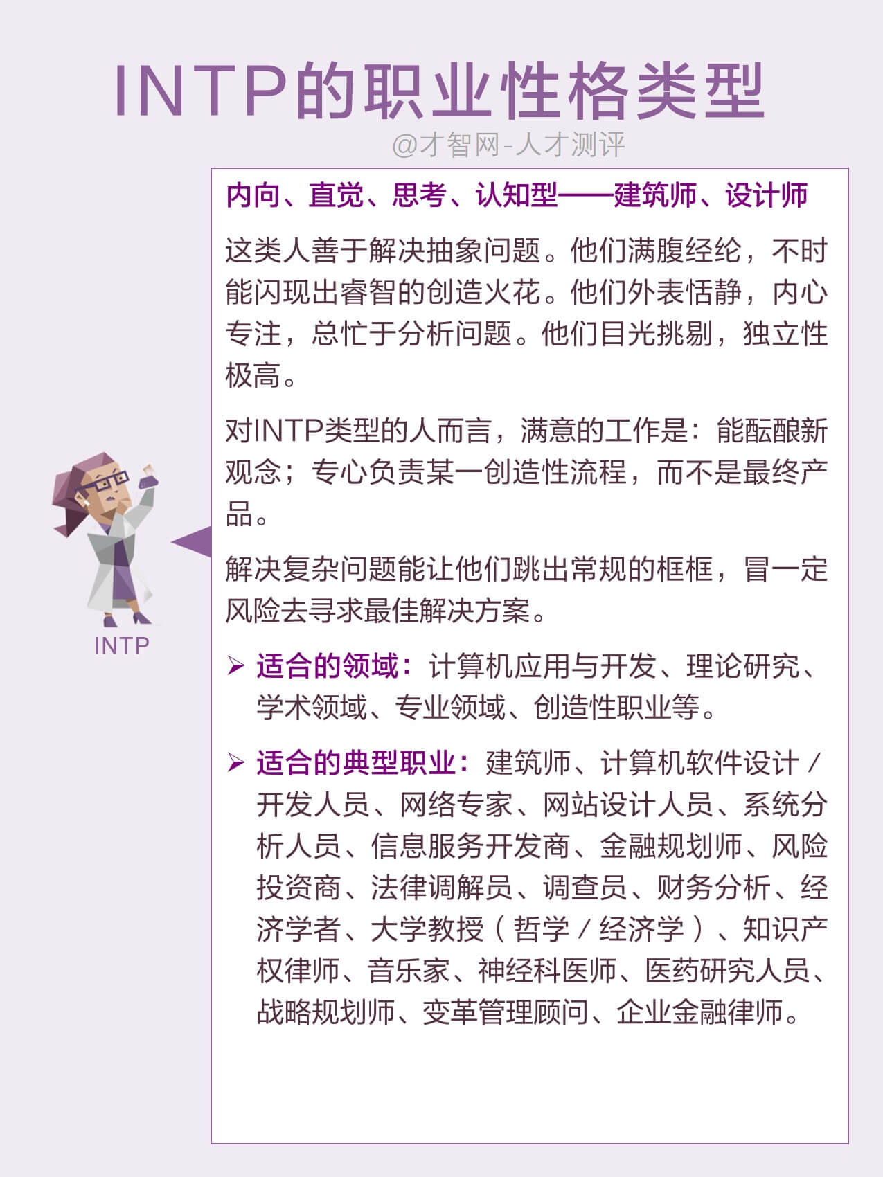 适合的典型职业:建筑师、计算机软件设计/开发人员、网络专家、网站设计人员、系统分析人员、信息服务开发商、金融规划师、风险投资商、法律调解员、调查员、财务分析、经济学者、大学教授(哲学/经济学)、知识产权律师、音乐家、神经科医师、医药研究人员、战略规划师、变革管理顾问、企业金融律师。
