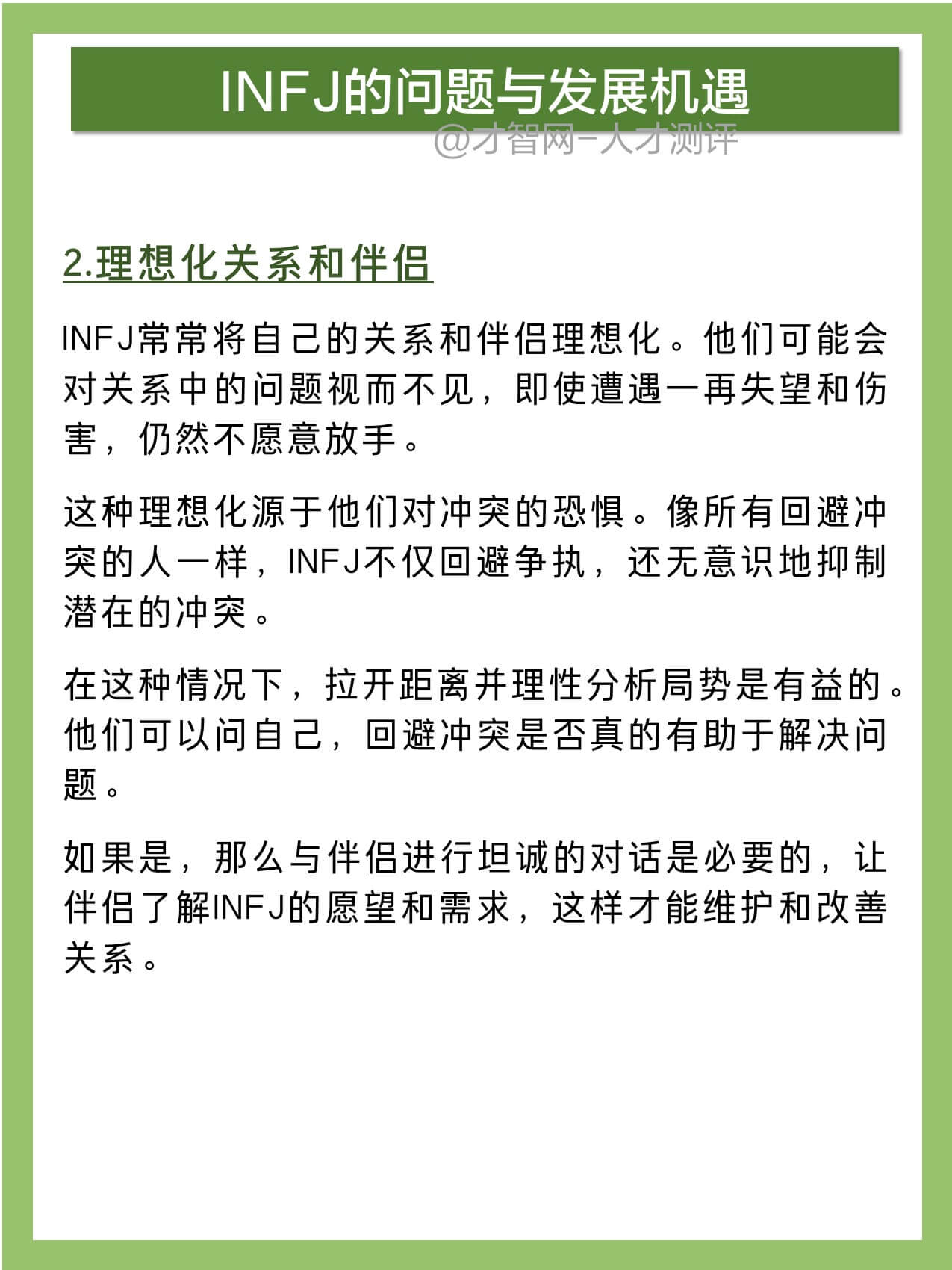 另一个挑战是,INFJ常常将自己的关系和伴侣理想化。他们可能会对关系中的问题视而不见,即使遭遇一再失望和伤害,仍然不愿意放手。这种理想化源于他们对冲突的恐惧。像所有回避冲突的人一样,INFJ不仅回避争执,还无意识地抑制潜在的冲突。在这种情况下,拉开距离并理性分析局势是有益的。他们可以问自己,回避冲突是否真的有助于解决问题。如果是,那么与伴侣进行坦诚的对话是必要的,让伴侣了解INFJ的愿望和需求,这样才能维护和改善关系。