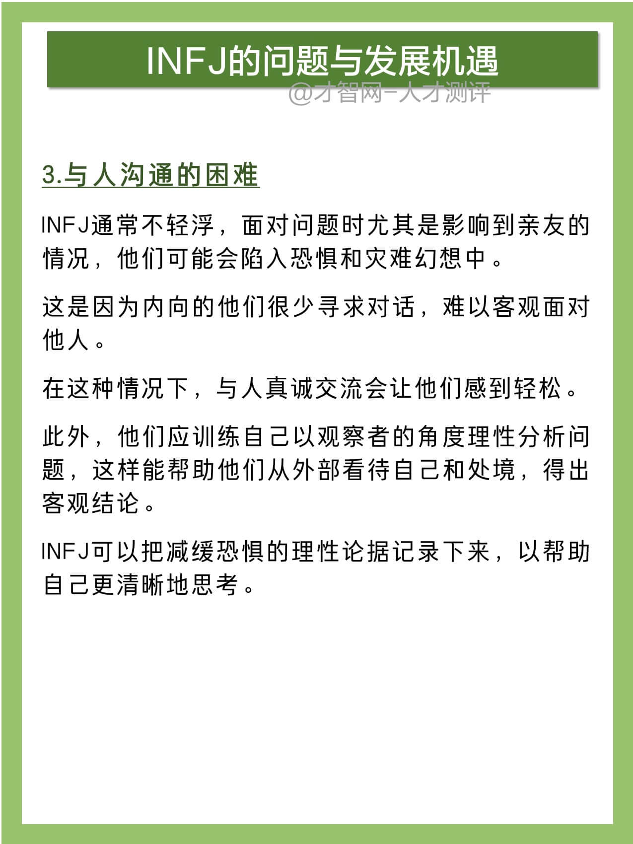 INFJ通常不轻浮,面对问题时尤其是影响到亲友的情况,他们可能会陷入恐惧和灾难幻想中。这是因为内向的他们很少寻求对话,难以客观面对他人。在这种情况下,与人真诚交流会让他们感到轻松。此外,他们应训练自己以观察者的角度理性分析问题,这样能帮助他们从外部看待自己和处境,得出客观结论。INFJ可以把减缓恐惧的理性论据记录下来,以帮助自己更清晰地思考。