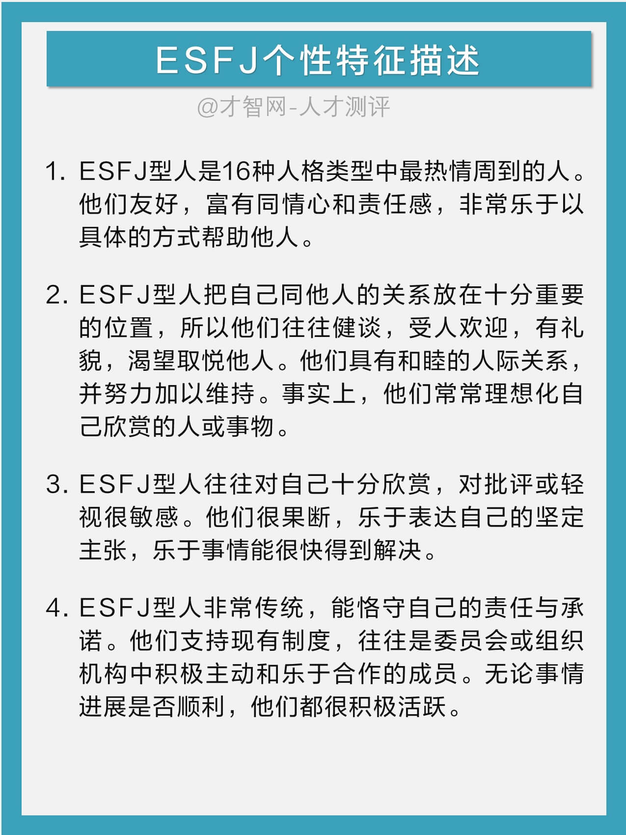 ESFJ型人把自己同他人的关系放在十分重要的位置,所以他们往往健谈,受人欢迎,有礼貌,渴望取悦他人。他们具有和睦的人际关系,并努力加以维持。事实上,他们常常理想化自己欣赏的人或事物。