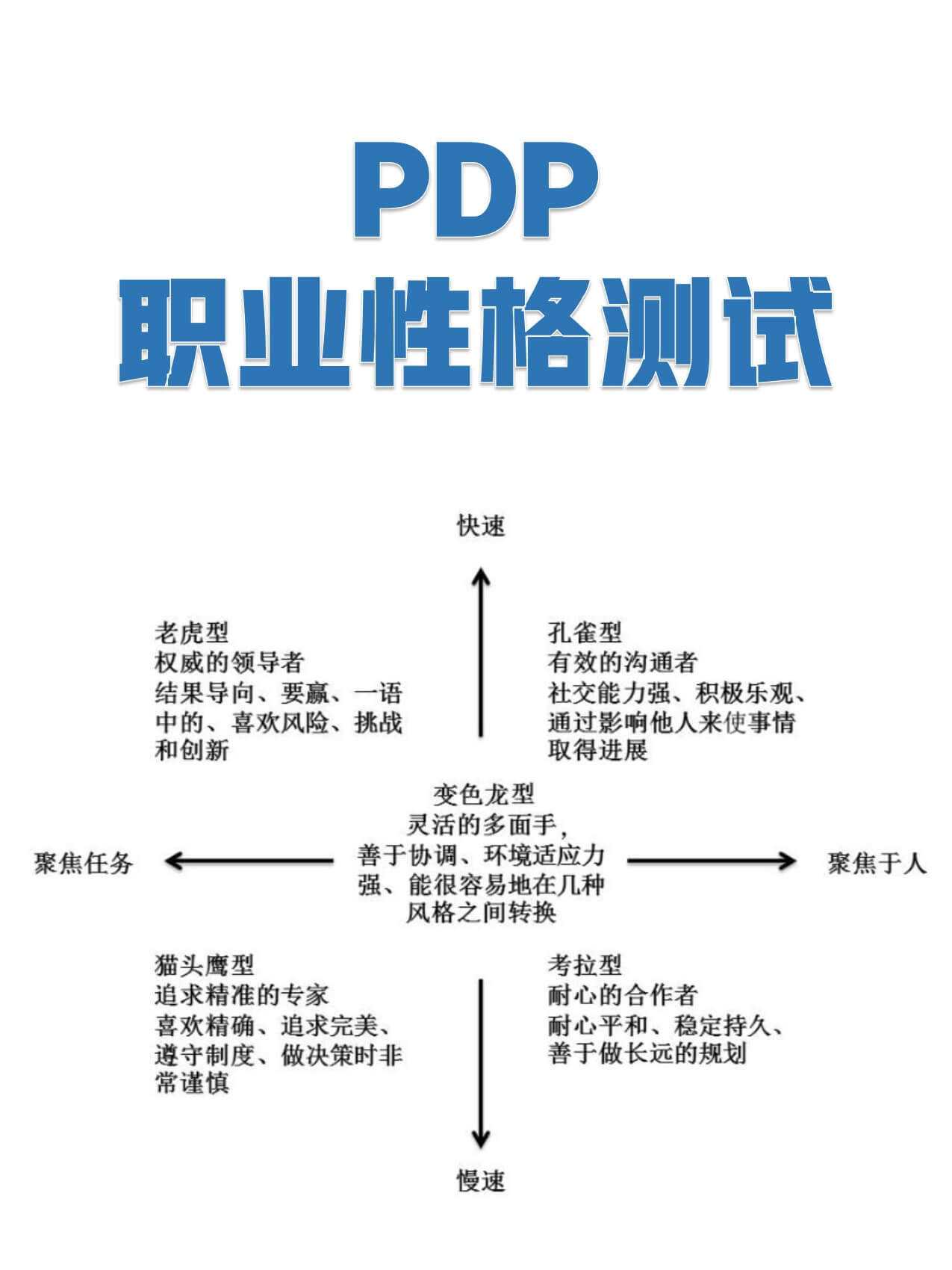 PDP职业性格测试因为采用了具备该性格特质的动物名称为性格维度分类名称,所以很容易被非专业人士记住和理解。它将人的性格分为老虎型、孔雀型、猫头鹰型、考拉型、变色龙型五个类型。