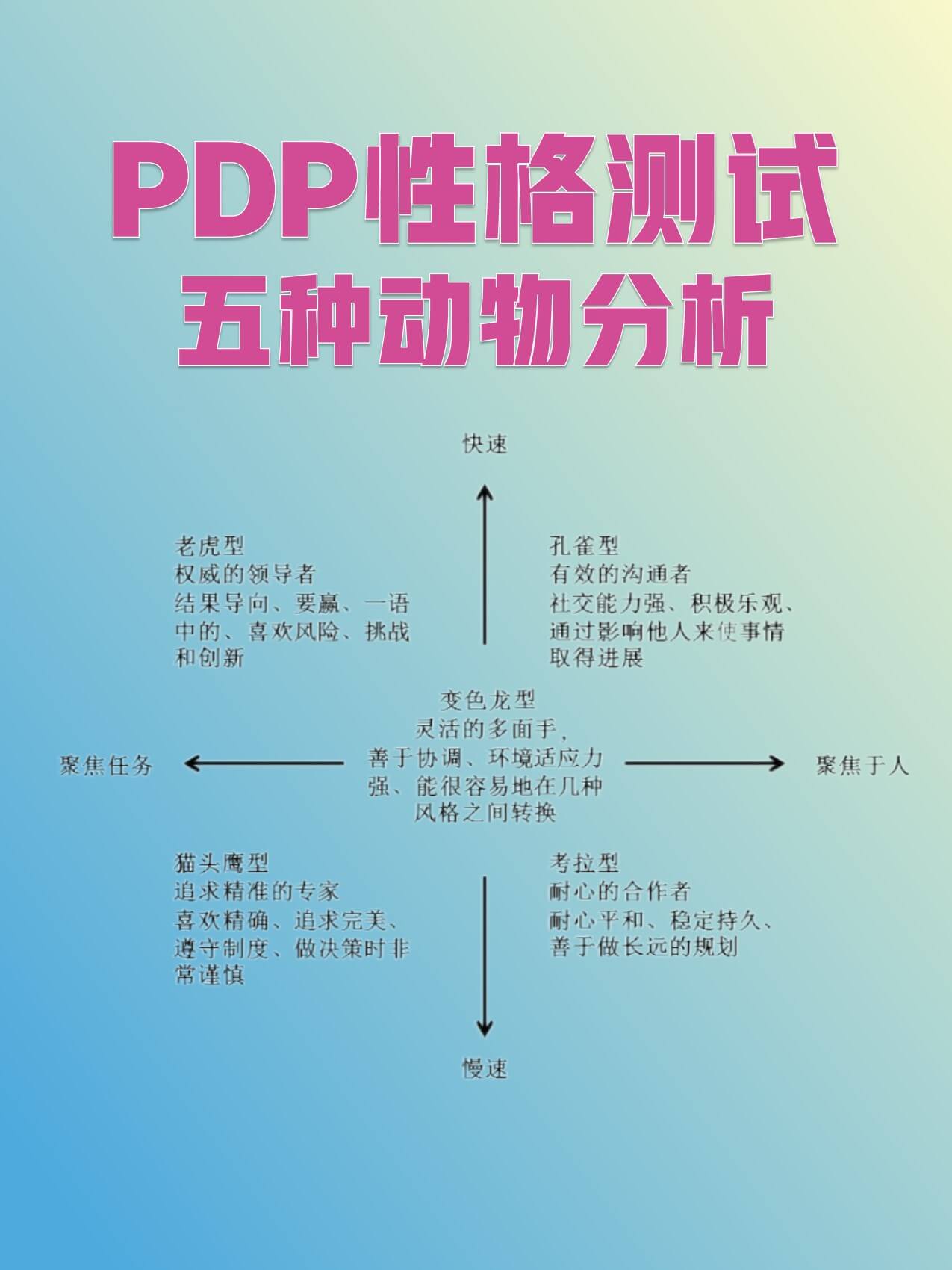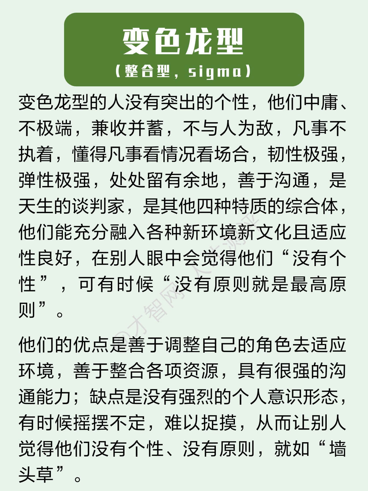变色龙型的人没有突出的个性,他们中庸、不极端,兼收并蓄,不与人为敌,凡事不执着,懂得凡事看情况看场合,韧性极强,弹性极强,处处留有余地,善于沟通,是天生的谈判家,是其他四种特质的综合体,他们能充分融入各种新环境新文化且适应性良好,在别人眼中会觉得他们“没有个性”,可有时候“没有原则就是最高原则”。