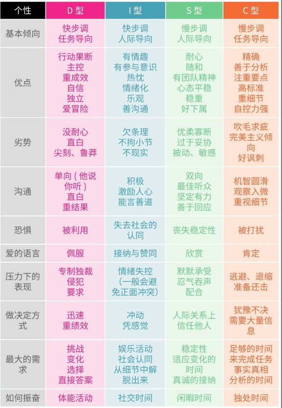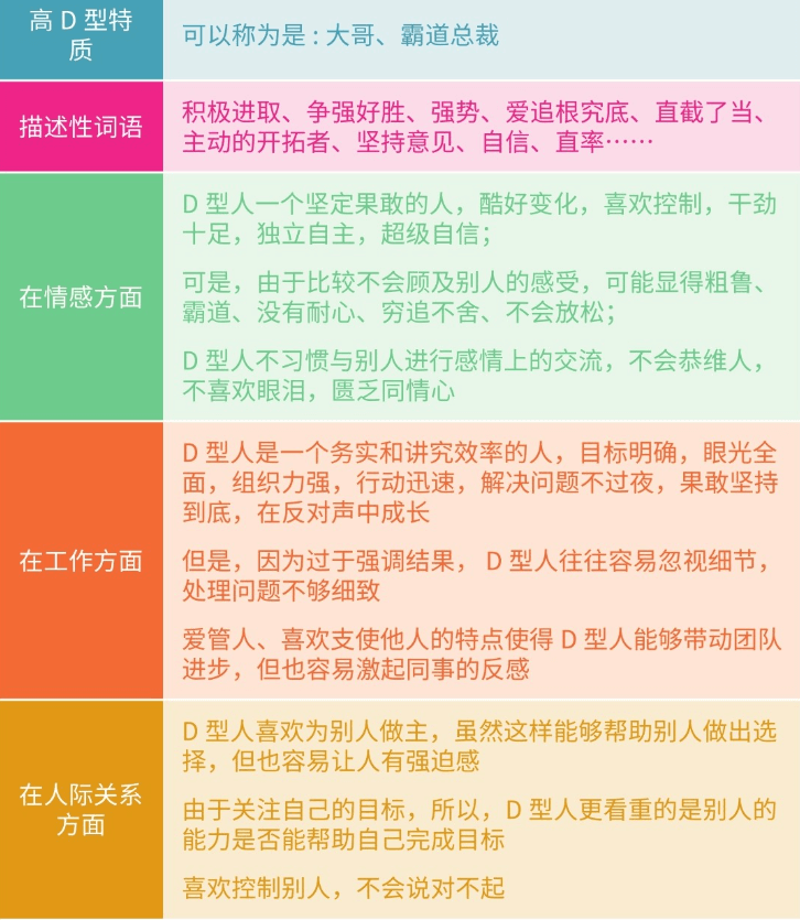 在工作方面:D 型人是一个务实和讲究效率的人,目标明确,眼光全面,组织力强,行动迅速,解决问题不过夜,果敢坚持到底,在反对声中成长;但是,因为过于强调结果,D型人往往容易忽视细节处理问题不够细致;爱管人、喜欢支使他人的特点使得 D型人能够带动团队进步,但也容易激起同事的反感;