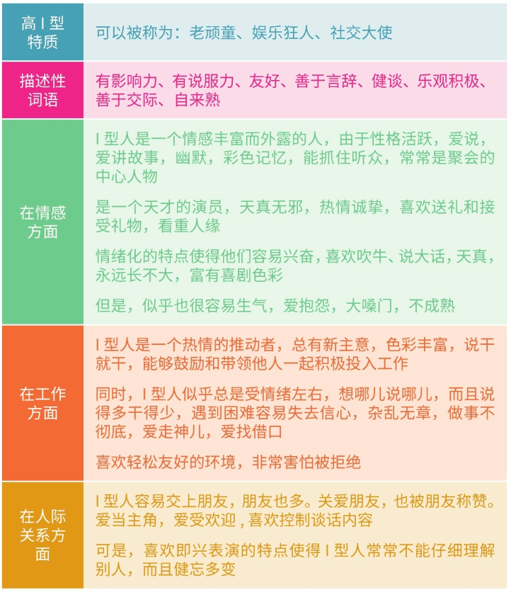 高I型特质:可以被称为:老顽童、娱乐狂人、社交大使