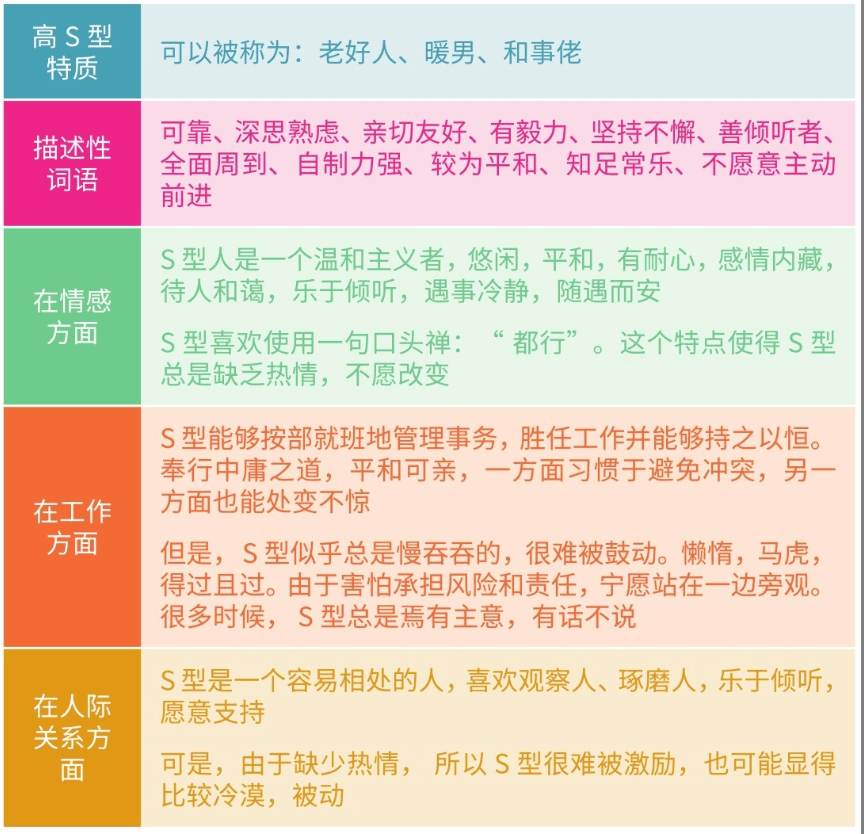 在情感方面:S 型人是一个温和主义者,悠闲,平和,有耐心,感情内藏,待人和蔼,乐于倾听,遇事冷静,随遇而安;S 型喜欢使用一句口头禅:都行”。这个特点使得S型总是缺乏热情,不愿改变;