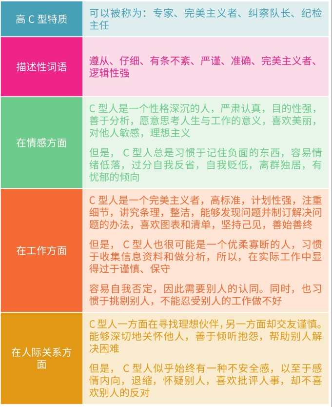高C型特质:可以被称为:专家、完美主义者、纠察队长、纪检主任
