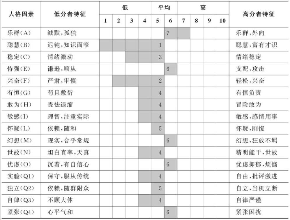 低分特征包括严肃,审慎,冷静,寡言。高分特征包括轻松兴奋,随遇而安。