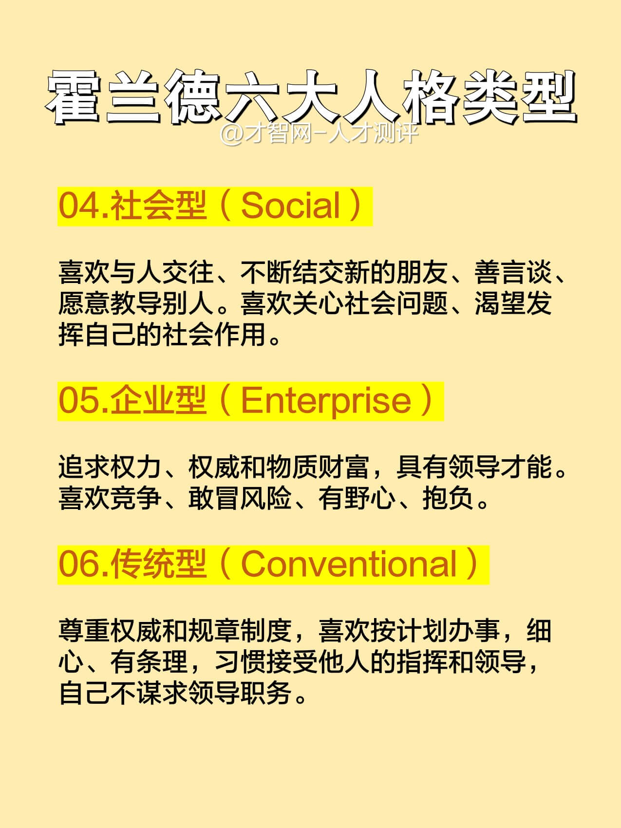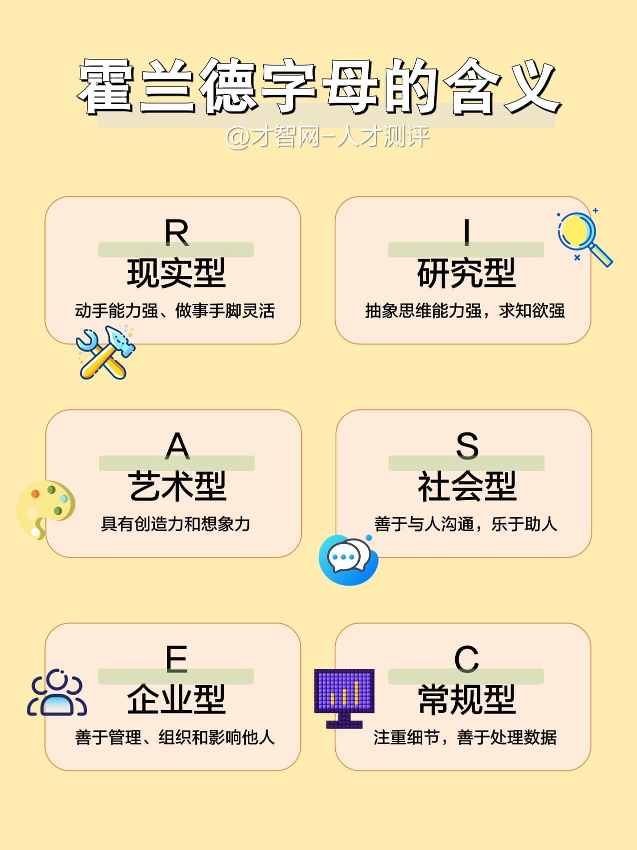 霍兰德职业兴趣理论认为人的人格类型、兴趣与职业密切相关人格可分为🔥现实型、艺术型、社会型、企业型、常规型、研究型等6种类型。适合用于招聘选拔、职业生涯规划、职业发展等方面。